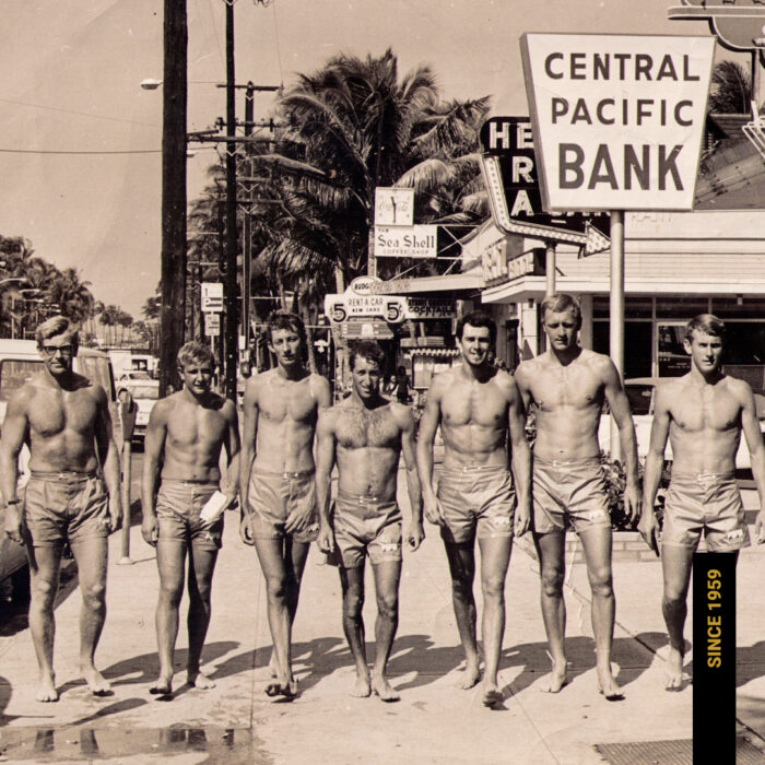 When Kevin, Midget and Nat set off to Hawaii to participate in the 1963 Makaha International Surf Championship, Platts would have been in their suitcases. Australian-made boardshorts were being worn…